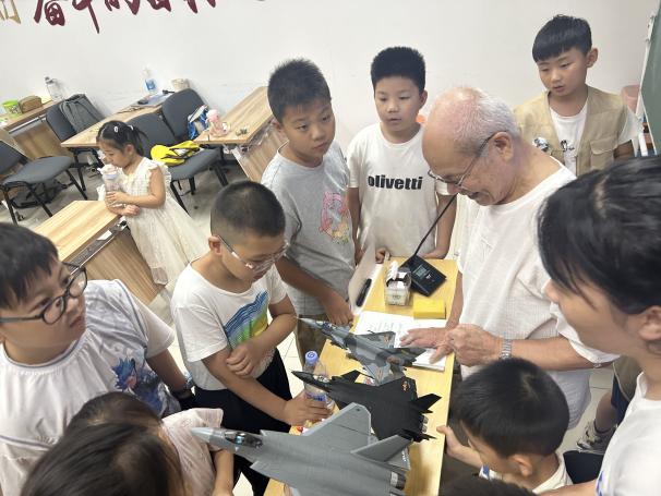 退役老兵赵鑫楠老师以其深厚的军事素养与真挚情怀担纲主讲。在他深入浅出的讲解中,银鹰不再仅是冰冷的钢铁之躯,更承载着科技强国的壮阔征程与守卫和平的坚定信念。现场陈列的歼-35、歼-20、歼-10、阵风、幻影等中外知名战机模型,成为最直观的教材,瞬间点燃了孩子们的好奇心与求知欲。他们簇拥在展台旁,目光炯炯,惊叹连连。更令人欣喜的是,小小军事爱好者汤同学化身“小专家”,对战机性能、历史背景如数家珍,自信的分享赢得阵阵掌声,展现出新一代青少年开阔的视野与强烈的爱国热忱。