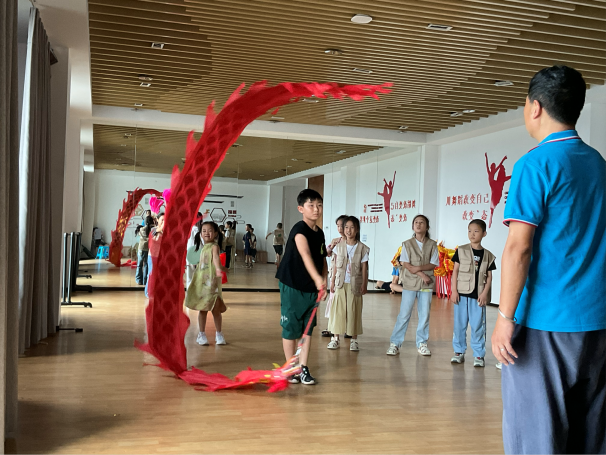 从初握竹骨龙的生涩到协作盘龙的默契,少年们在民间艺术家房剑的指导下完成蜕变。首节课中,孩子们学习竞技与传统舞龙的精髓,实操时龙身打结的慌乱犹在眼前;至第三课,闪着金光的红绸舞龙已能随鼓点翻飞成浪,“盘龙”造型一气呵成。汗水浸透的衣襟、掌心深刻的棉绳勒痕,无声诉说着他们从碎步踉跄到步履齐整的蜕变。课程尾声更添新彩,拓展课堂内容引入“健身龙”体验教学,让孩子们感受单人舞动彩色绸龙的轻灵与乐趣,体味非遗技艺在现代健身中的创新活力。