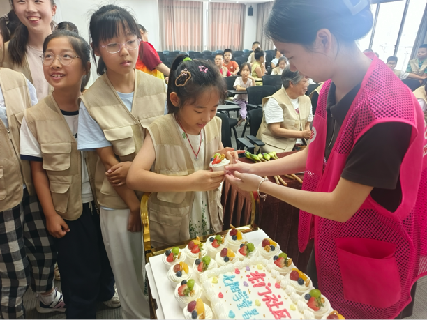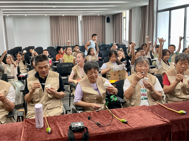 结课蛋糕推入时,《小星星》旋律轻漾。大哥哥姐姐给大家分蛋糕,孩子们首先递给了爷爷奶奶们,银发与童颜相映成趣。联欢会的最后,青年志愿者呼唤孩子们一起合影留念,嘻嘻闹闹的画面,连快门都捕满了温度。