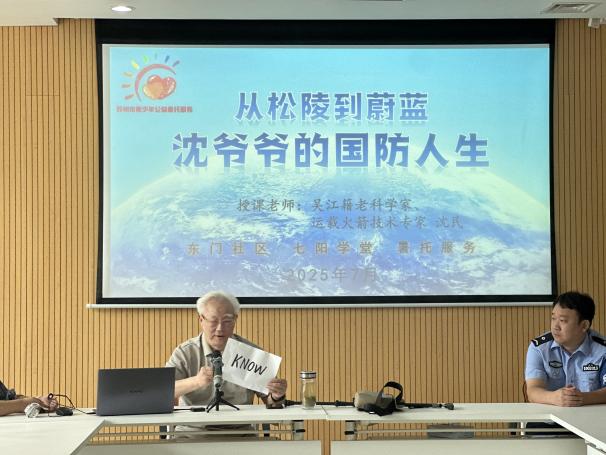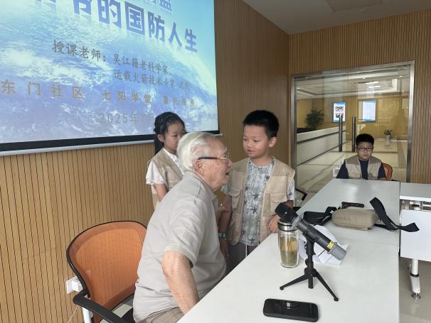 为了在青少年心中厚植家国情怀、点燃科技梦想、激励他们勇担民族复兴的时代重任,8月14日下午,松陵街道东门社区特邀我国航天领域的功勋科学家沈民教授为社区青少年带来一堂生动而深刻的红苗培育课程“从松陵到蔚蓝:沈爷爷的国防人生”。