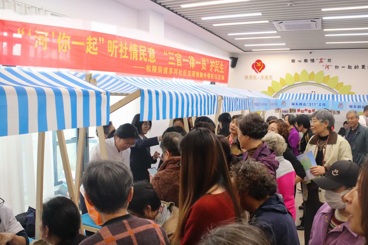 为精准回应群众急难愁盼,将服务触角延伸至“家门口”,近日,吴江区松陵街道“‘河’你一起”代表联络站联合苏河社区幸福“河”伙人成员单位,在苏河社区党群服务中心举办法理情融合便民日活动。本次活动以“‘河’你一起听社情民意,‘三官一律一员’护民生”为主题,将专业法律服务、精准民意收集与贴心便民举措深度融合,为辖区居民送上一场有温度、有力度、有精度的“民生盛宴”。